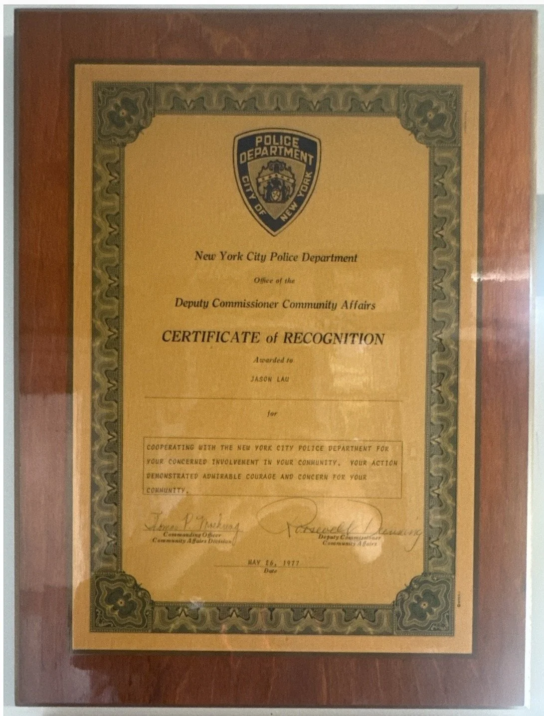 In May 1977, the New York City Police Department presented him with a Certificate of Recognition for his efforts in helping to reduce crime in the community.